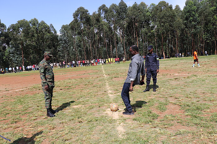 Umuyobozi w'akarere Bwana Mupenzi Narcisse atangiza umupira hagati ya Nyabitekeri na Mahembe