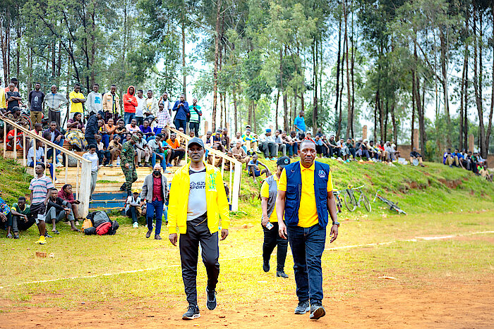 Meya Mupenzi Narcisse ari kumwe na Visi Perezida wa Komisiyo Tuyizere Thaddée bajya gutangiza umupira
