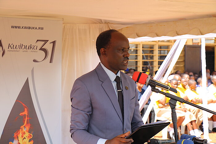 Umuyobozi w'akarere ka Nyamasheke Bwana Mupenzi Narcisse ubwo yagezaga ijambo ry'ikaze ku bitabiriye Kwibuka 31